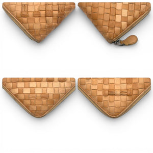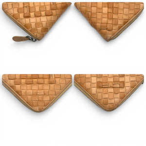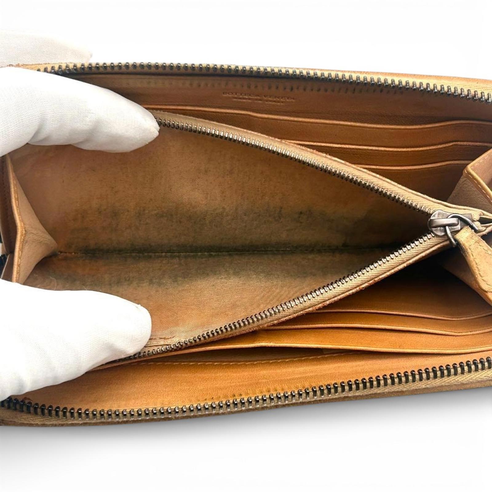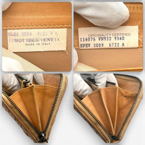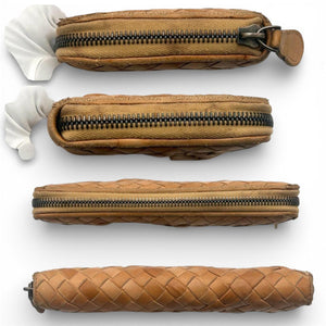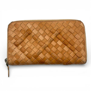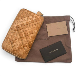 This Bottega Veneta wallet features the brand's iconic Intrecciato woven leather design in a warm tan shade. It has a zip-around closure to securely hold your essentials.