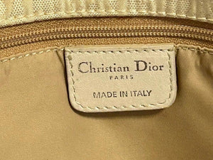This elegant Christian Dior tote handbag features a beige monogram pattern with white leather handles and silver-tone hardware. It offers a spacious interior suitable for everyday use or special occasions.