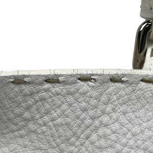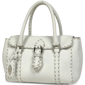 This Fendi satchel bag is crafted from white leather with distinctive stitched detailing along the edges and handles. It features dual top handles and a buckle accent on the front flap, combining style and functionality for everyday use.
