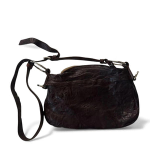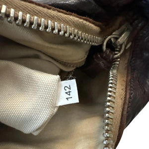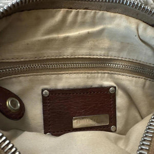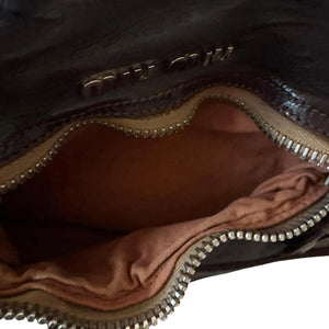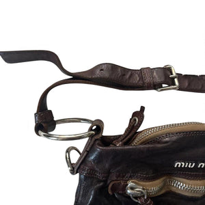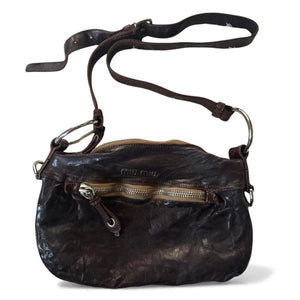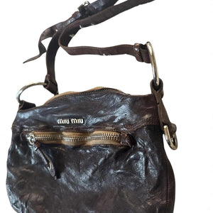 This Miu Miu crossbody bag is crafted from brown leather with a front zip pocket and silver-tone hardware. It features an adjustable strap for versatile wear and a zip closure to keep belongings secure. The leather shows natural wear consistent with previous use, adding character to this stylish accessory.