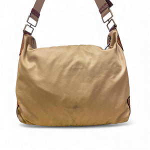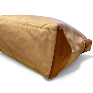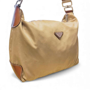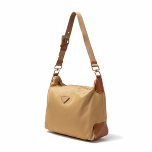This Prada shoulder bag features a beige body with brown leather trim on the corners and strap ends. It has an adjustable shoulder strap and a triangular Prada logo plaque on the front. The bag offers a stylish and practical design suitable for everyday use.