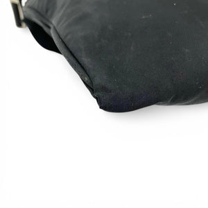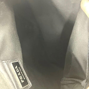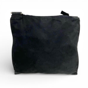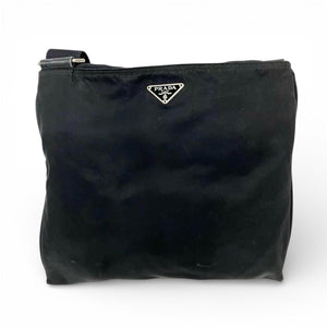 This Prada black nylon crossbody bag is a versatile and practical accessory. It features a sleek design with the iconic Prada triangular logo on the front and an adjustable shoulder strap for comfortable wear.