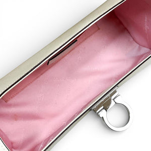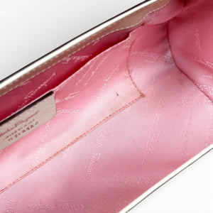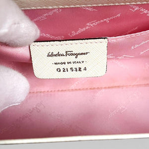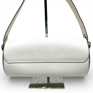 This Salvatore Ferragamo white leather shoulder bag features a sleek cylindrical shape with a structured design. It includes a silver-tone clasp and a single adjustable strap for versatile wear. The bag is crafted from textured leather, offering durability and a refined look.
