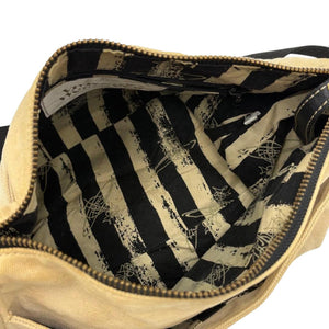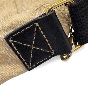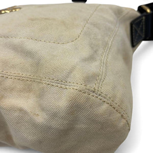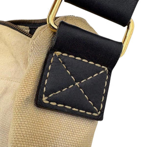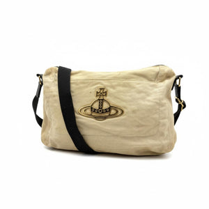 This Vivienne Westwood men's shoulder bag features a beige canvas body with the iconic orb logo in metal detail on the front. It has a black adjustable shoulder strap for comfortable wear. The bag is spacious enough for everyday essentials, combining style and practicality.