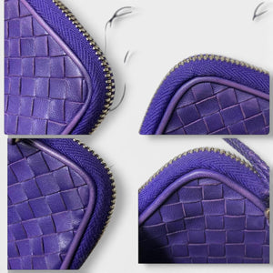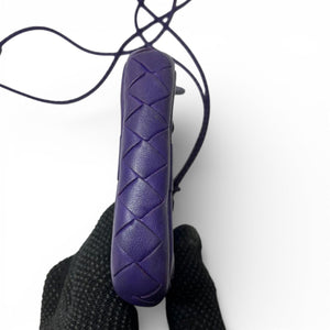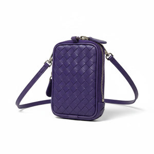 This elegant purple leather crossbody bag features a woven design characteristic of Bottega Veneta. It includes a zip closure with dual zipper pulls and a slim adjustable strap for comfortable wear. The compact size makes it perfect for carrying essentials hands-free.