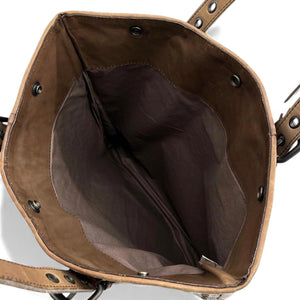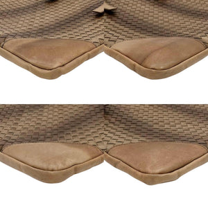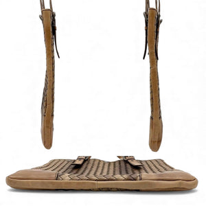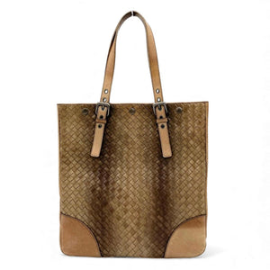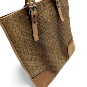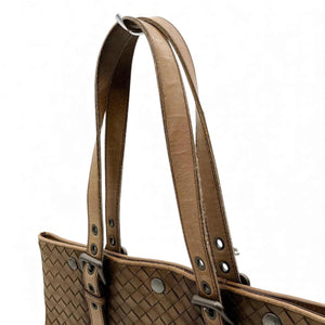 This woven leather Bottega Venate tote bag features a spacious interior and sturdy double handles with buckle details. The brown tone and leather accents at the corners add a classic touch, making it a versatile accessory for everyday use.