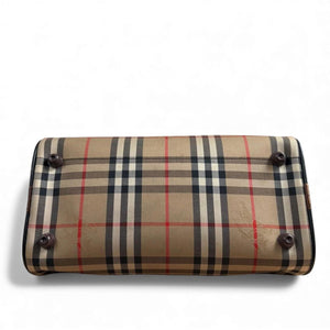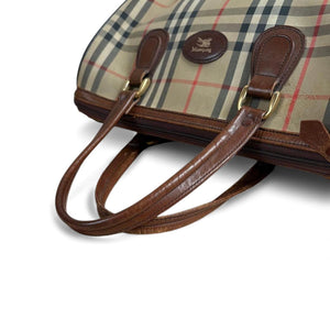 This Burberry handbag features the iconic vintage check pattern with brown leather handles and trim. It is a spacious and stylish accessory suitable for everyday use or special occasions.