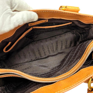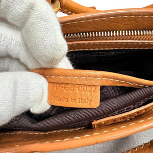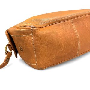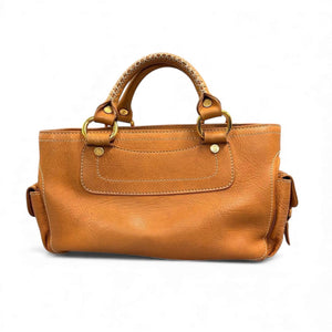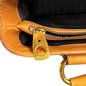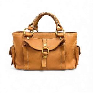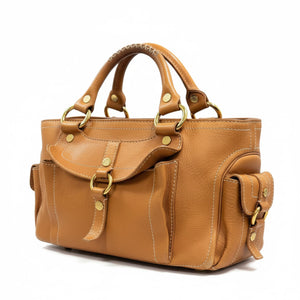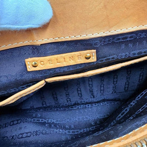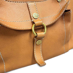 This Celine handbag features a soft tan leather construction with gold-tone hardware accents. It includes a front flap pocket secured with a gold ring and snap button, two sturdy top handles, and side pockets with snap closures for added functionality. The leather has a textured finish and is complemented by white contrast stitching.