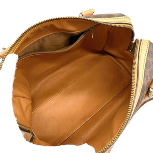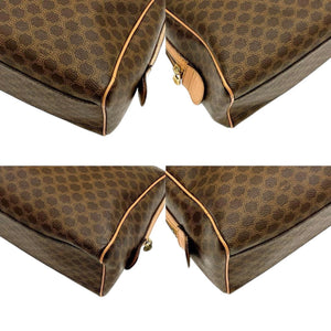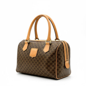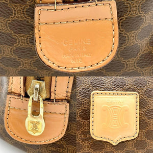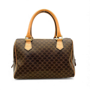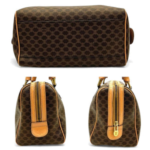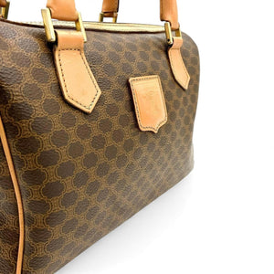 This vintage Celine handbag features a classic brown monogram canvas with tan leather handles and trim. The bag has a structured rectangular shape with a zippered top closure and gold-tone hardware.