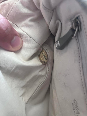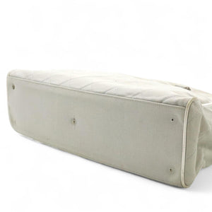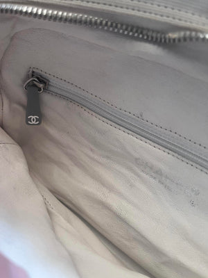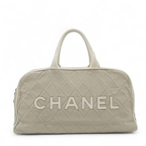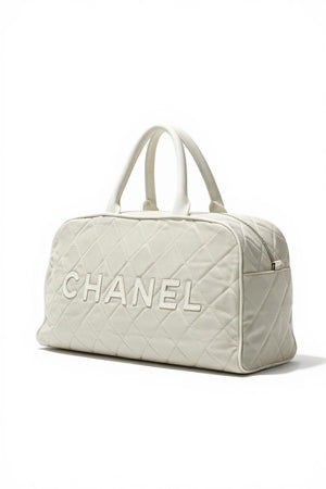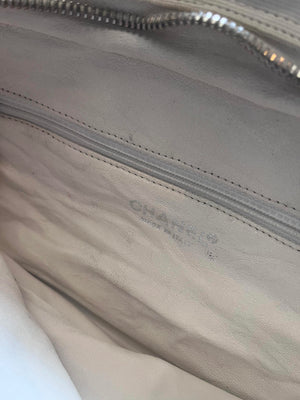 This Chanel handbag features a classic quilted leather design with the brand's logo prominently displayed on the front. It offers a spacious interior suitable for daily essentials and a zippered back pocket for additional storage. The double handles provide comfortable carrying options.