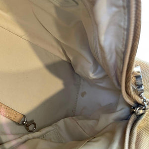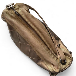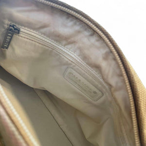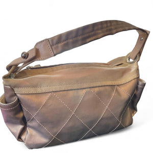 This Chanel quilted small shoulder handbag features a neutral beige tone with a diamond quilted pattern and durable fabric strap. It has a zip closure and side pockets, making it practical for everyday use while maintaining an elegant look.