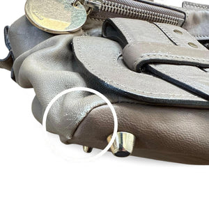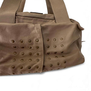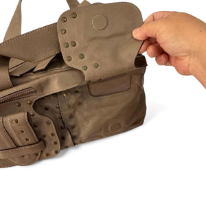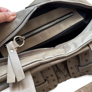 This contemporary Chloé handbag features a taupe colour with studded pocket flaps on the front and sturdy double handles. It offers practical zippered compartments and a unique magnetic flap pocket for added convenience and style.