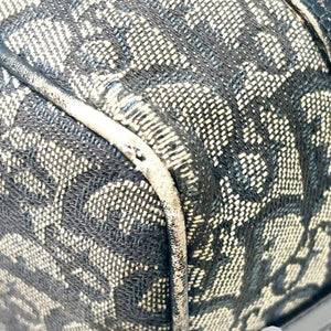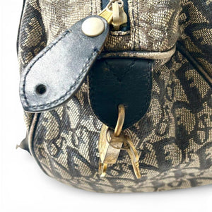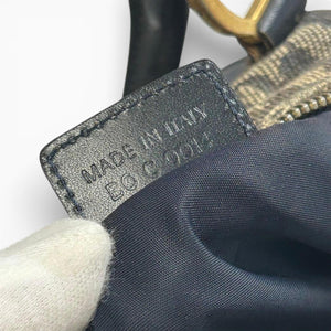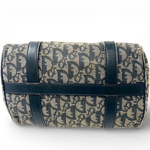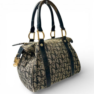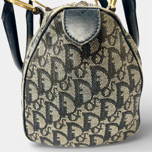 This vintage Christian Dior handbag features the iconic monogram canvas with black leather trim and gold-tone hardware. It offers a spacious interior with a zippered pocket for organisation. The structured design and double handles make it a versatile accessory for everyday use or special occasions.