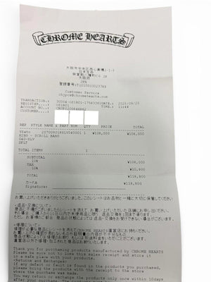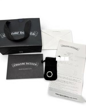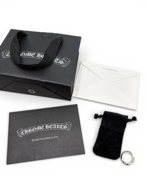This Chrome Hearts sterling silver ring features an intricate scroll band design, emblematic of the brand's gothic-inspired style. Crafted with high-quality sterling silver, it combines durability with distinctive aesthetics.
