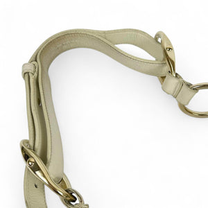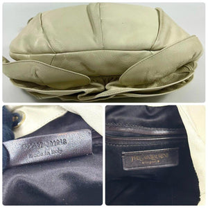 This Yves Saint Laurent handbag features a distinctive ruffled leather design in a soft cream color, perfect for adding a touch of elegance to any outfit. The bag is crafted from high-quality leather, offering durability and a luxurious feel. Its medium size makes it practical for everyday use while maintaining a chic appearance.