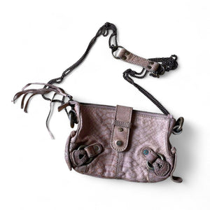 This women's crossbody bag features a pink leather exterior with a textured pattern and decorative buckle details. It includes a chain strap with a leather shoulder pad for comfortable wear. The bag closes securely with a zipper and a snap tab.
