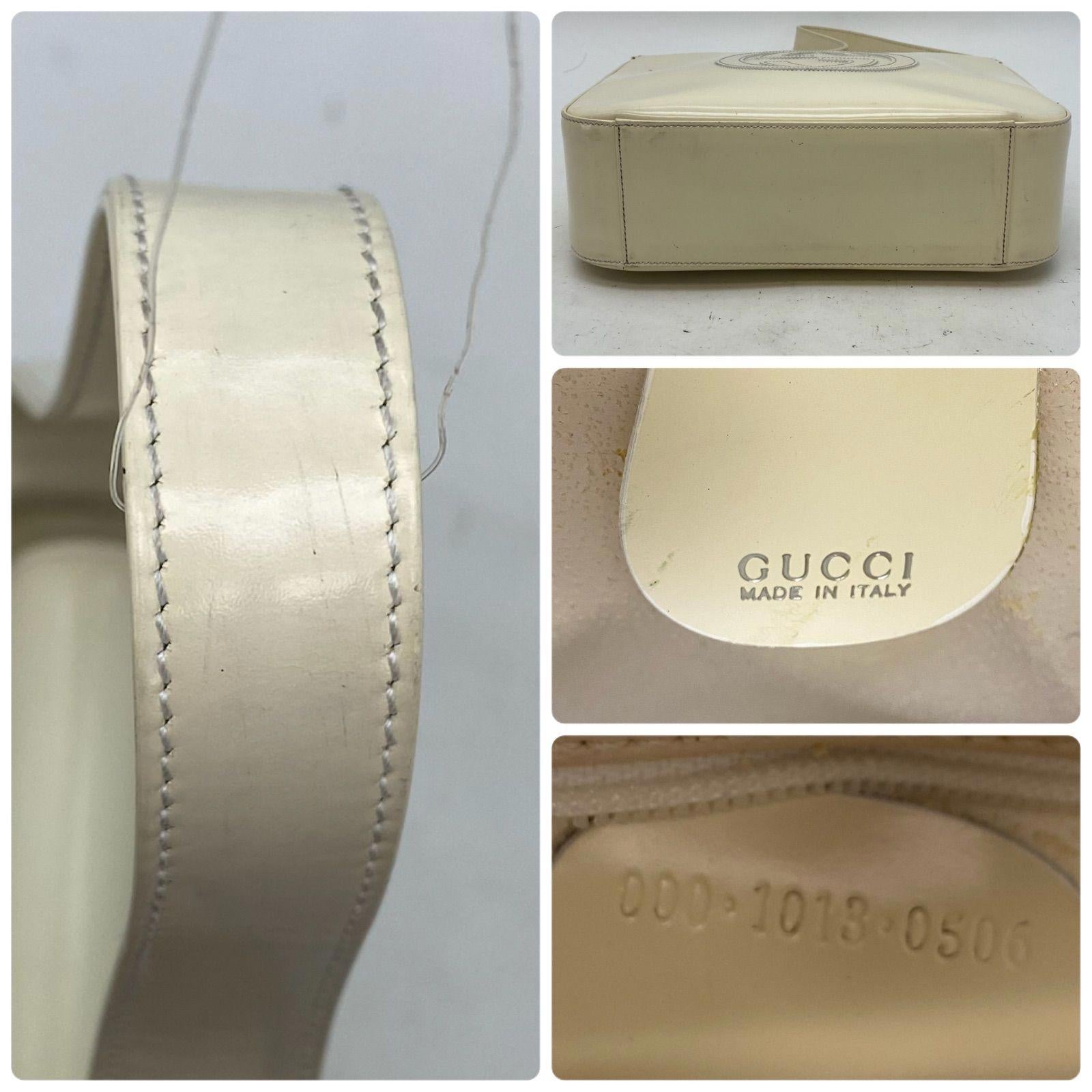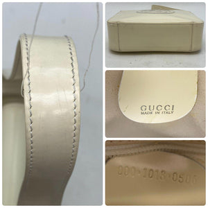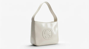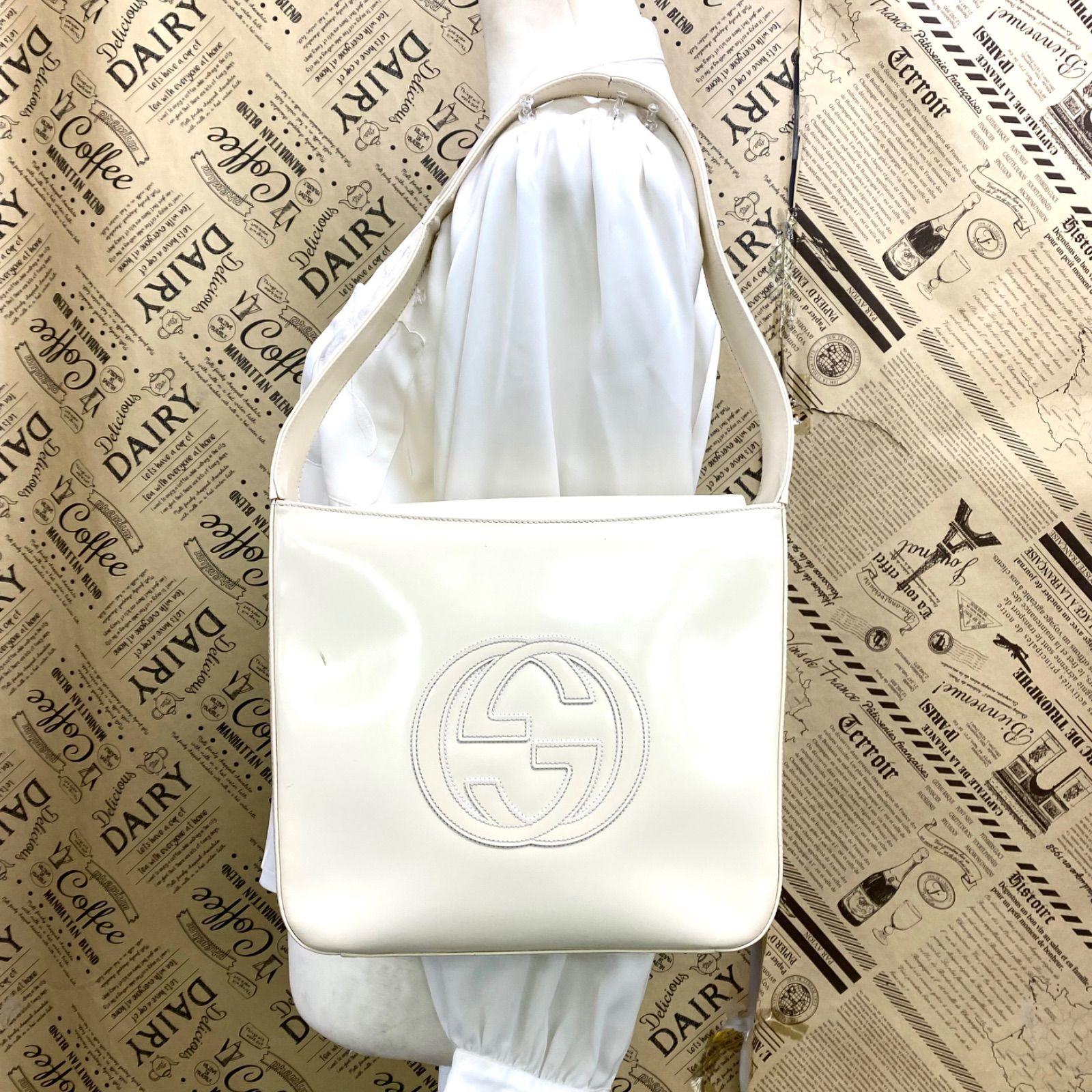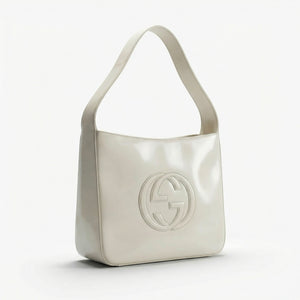 This Gucci shoulder bag features a clean, minimalist design in white leather, accented by the iconic interlocking G logo embossed on the front. It has a structured silhouette with a single wide strap for comfortable shoulder wear. The bag is crafted with quality leather and sturdy stitching, suitable for everyday use or special occasions.