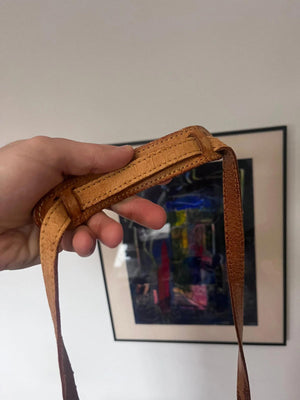 This Louis Vuitton crossbody bag features the iconic monogram canvas with natural leather trim and gold-tone hardware. It has a front flap with a buckle detail and an adjustable leather strap for comfortable wear. The compact size makes it perfect for carrying essentials while maintaining a stylish look.