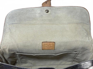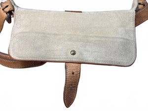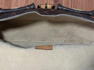 This Louis Vuitton shoulder bag features the iconic monogram canvas with natural leather trim and brass hardware. It includes two front pockets with buckle closures and a secure flap top with an adjustable leather strap. The interior is lined with a light beige suede-like material.
