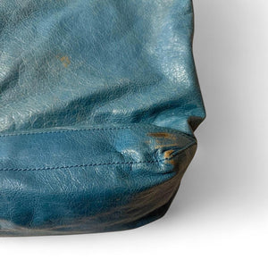 This Balenciaga women's shoulder bag features a spacious design in blue leather with a front zip pocket and adjustable strap. It's a versatile accessory suitable for everyday use, combining style and practicality.