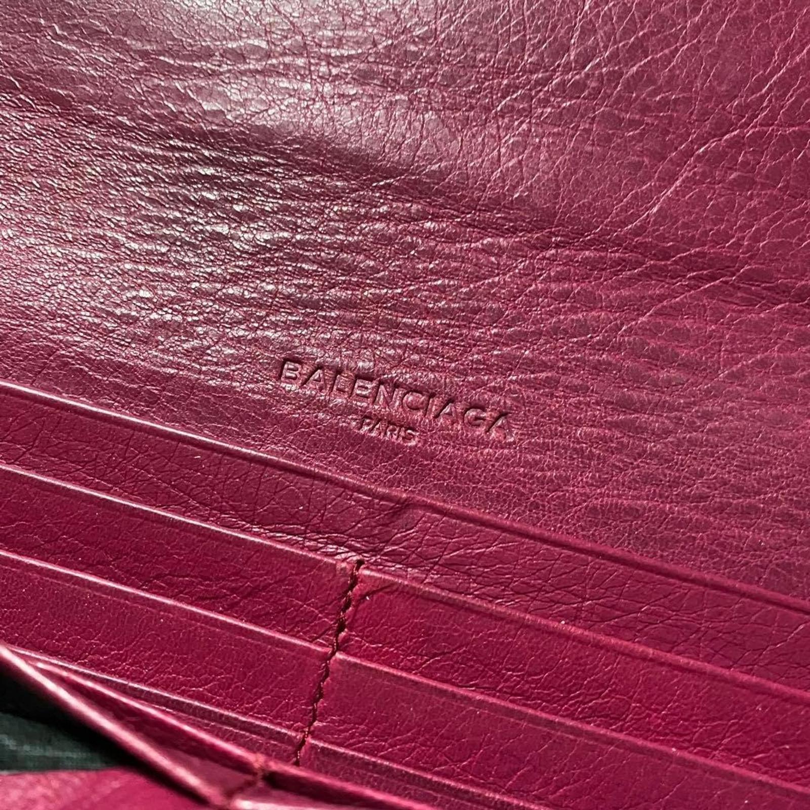 This burgundy leather wallet from Balenciaga features a zippered pocket and snap button closure, providing practical and stylish storage for essentials.