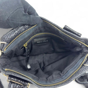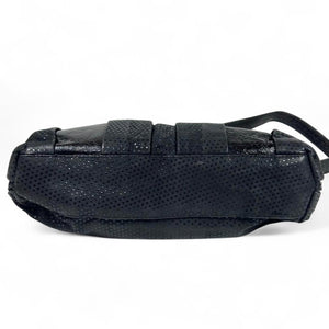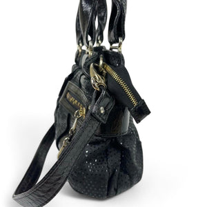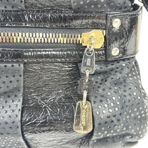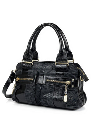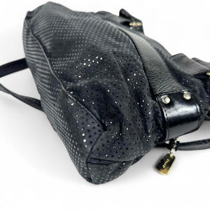 This elegant Chloé women's shoulder bag features a combination of smooth and perforated black leather with gold-tone hardware. It includes dual handles and a detachable shoulder strap for versatile carrying options. The front showcases two zippered pockets for easy access to essentials.