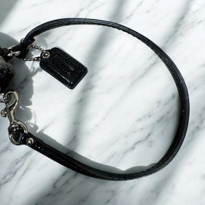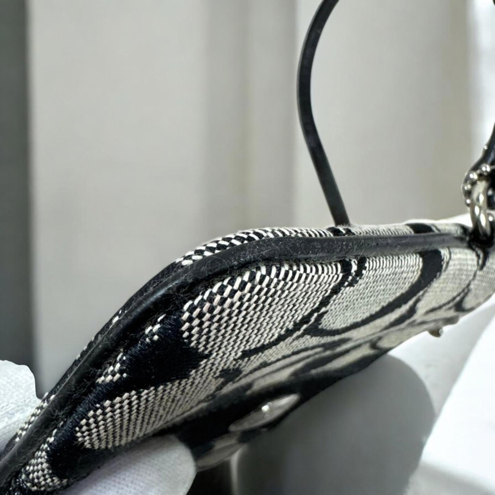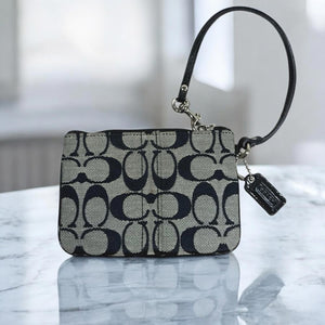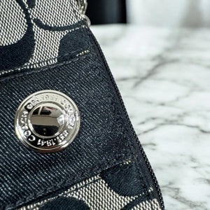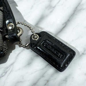 This Coach wristlet clutch features the brand's iconic signature canvas in a sophisticated black and beige colourway, accented with a central dark denim stripe and silver-tone hardware. It includes a detachable black leather wrist strap and a Coach leather tag charm, making it a versatile accessory for carrying essentials in style.