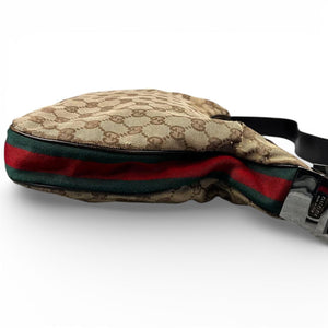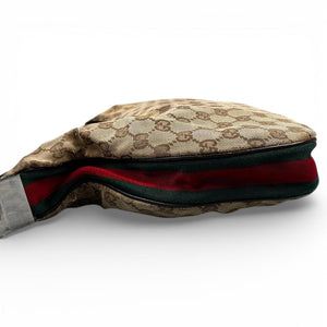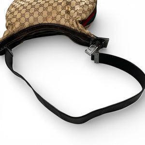 This Gucci shoulder bag features the iconic GG monogram canvas with black leather trim and an adjustable black strap, offering both style and practicality.