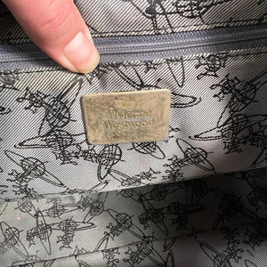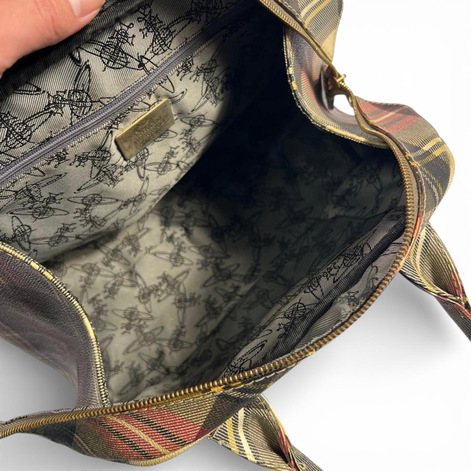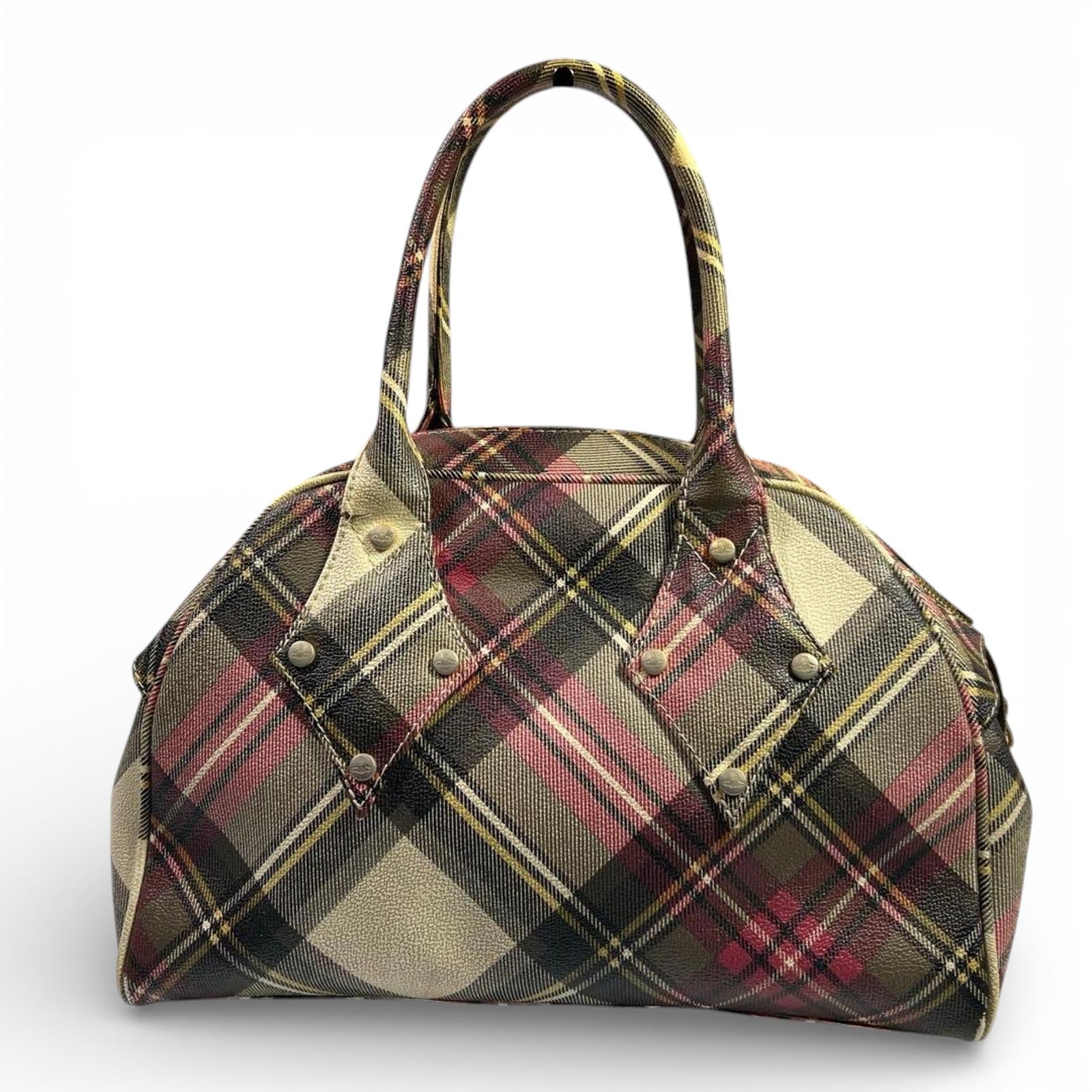 This Vivienne Westwood contemporary handbag features a stylish plaid pattern with a structured shape and sturdy handles. It offers a spacious interior suitable for daily essentials, combining both function and fashion.