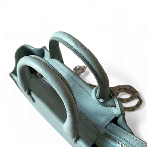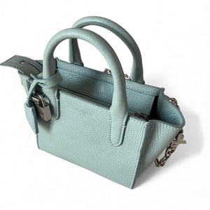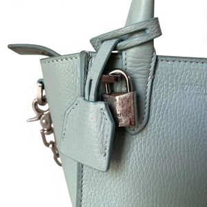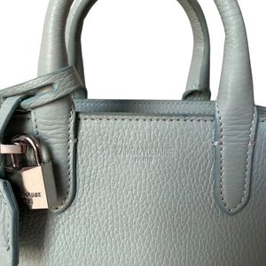 This elegant light blue mini handbag by Zadig & Voltaire is crafted from textured leather, featuring dual handles and a secure zip closure. The bag includes a decorative padlock and chain detail, adding a stylish edge to its compact and structured design. Ideal for everyday use or special occasions where a smaller bag is preferred.