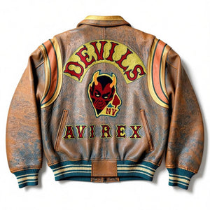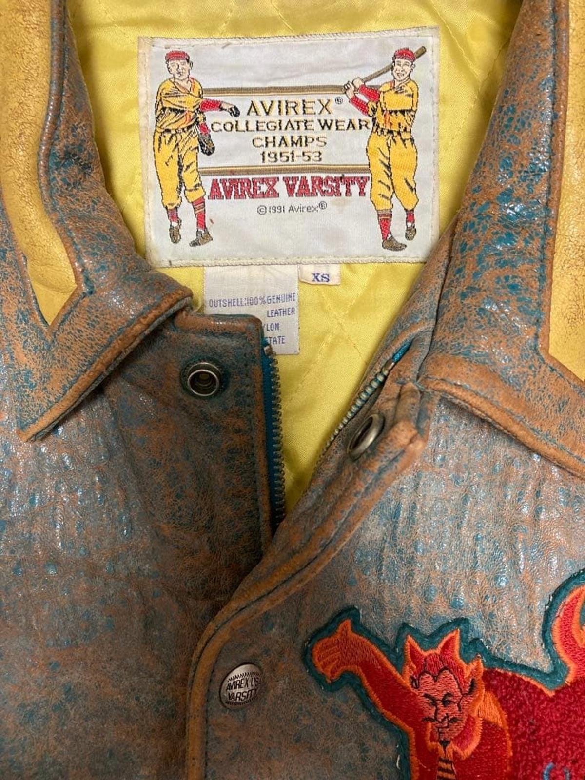 This vintage Avirex varsity jacket features a distinctive leather construction with a worn-in patina, accented by bold embroidered patches including a devil motif and varsity lettering. It has a classic varsity style with snap button closure, ribbed cuffs, and waistband.