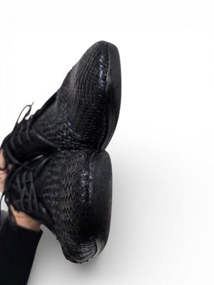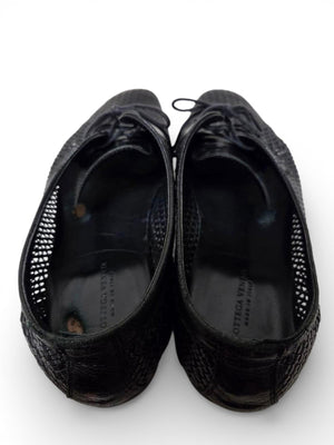 These men's oxfords by Bottega Veneta feature a distinctive woven leather design in black, combining elegance with breathability. Crafted in Italy, they offer a sophisticated look suitable for formal occasions or upscale casual wear.