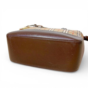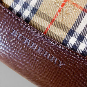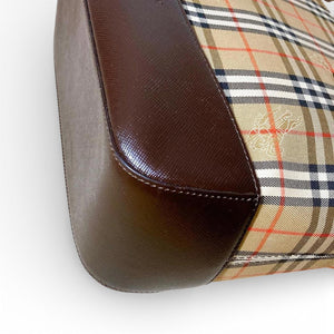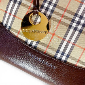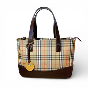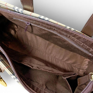 This Burberry tote bag features the iconic check pattern with dark brown leather trim and handles. It is a versatile accessory suitable for everyday use, combining classic style with practical design.
