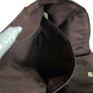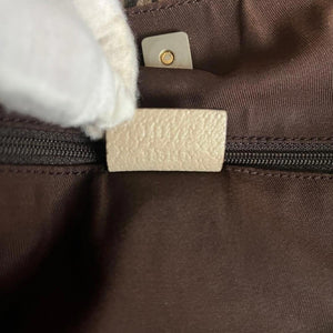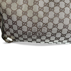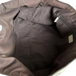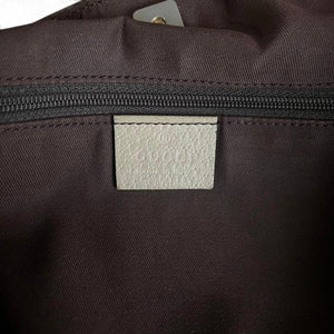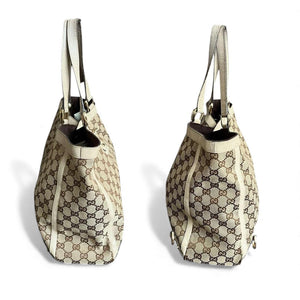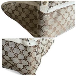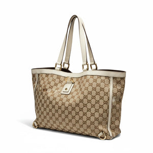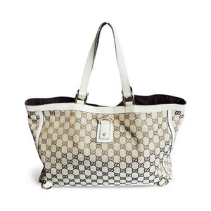 This Gucci tote bag features the iconic GG Supreme canvas pattern with white leather trim and handles. It offers a spacious interior with multiple pockets including a zippered compartment, making it practical for everyday use.