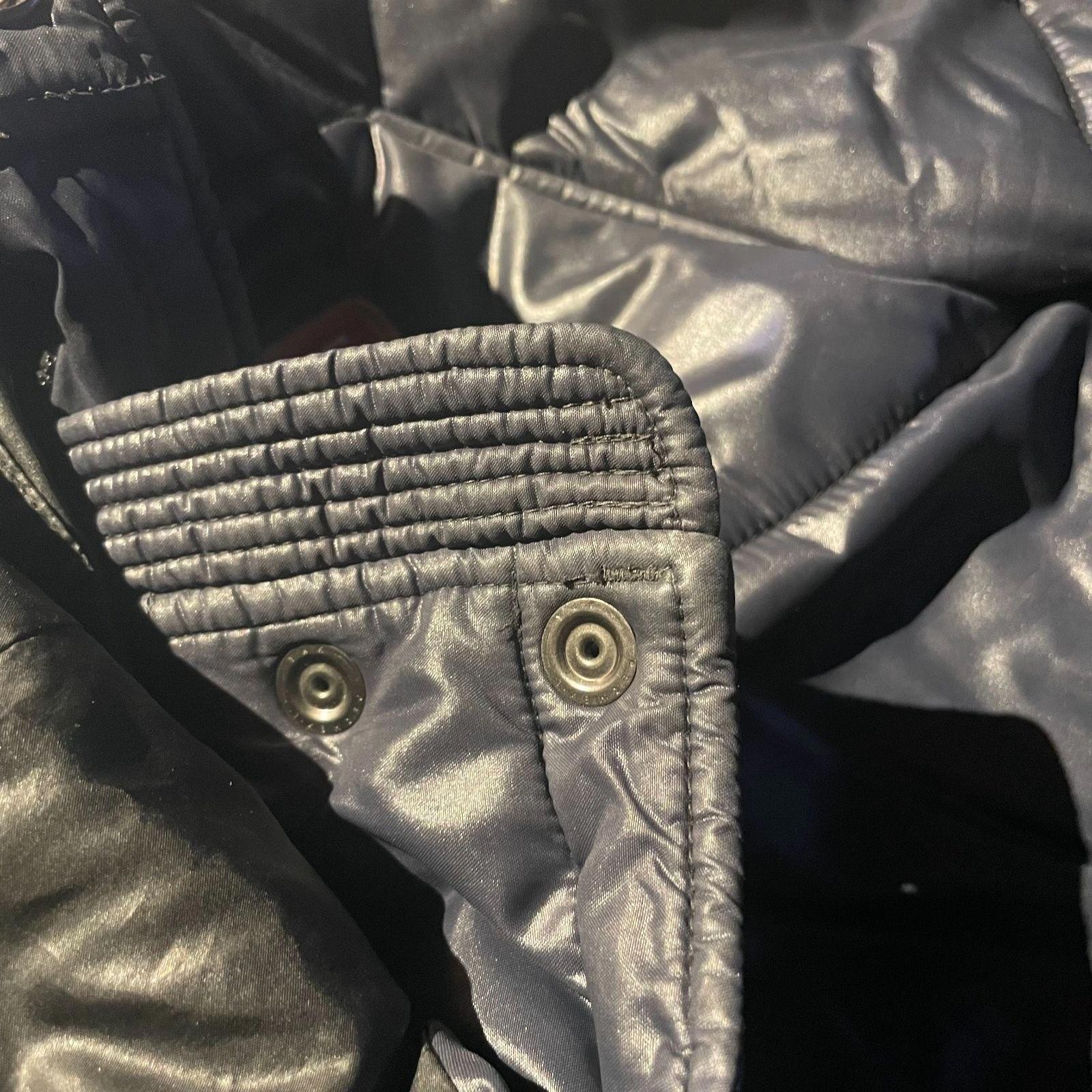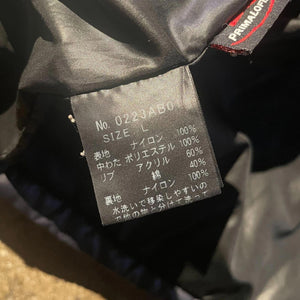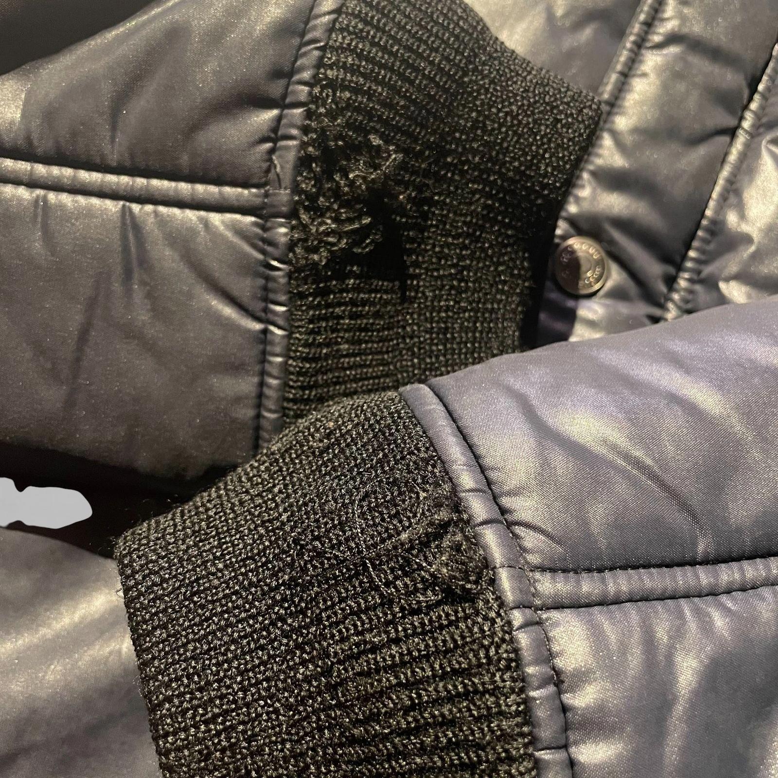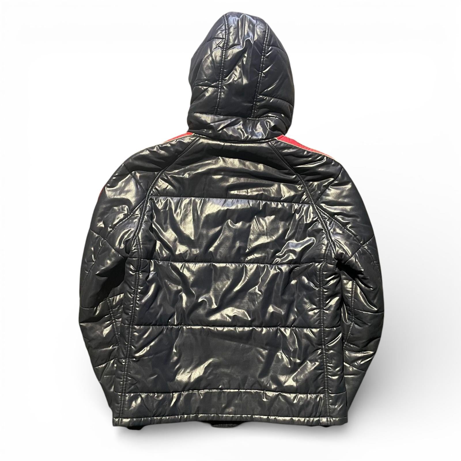 This men's black puffer jacket by Hysteric Glamour features a hood and red stripe detailing along the sleeves. It is made from nylon and polyester with acrylic and cotton ribbing, offering warmth and comfort.