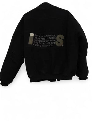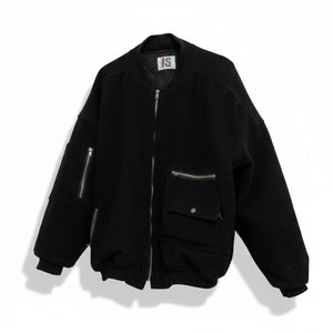 This men's bomber jacket by I.S. is crafted in black fabric featuring multiple zippered and buttoned pockets for practical storage. It has a front zip closure and ribbed cuffs and hem for a snug fit. The jacket offers a versatile and stylish outerwear option suitable for casual and semi-casual occasions.
