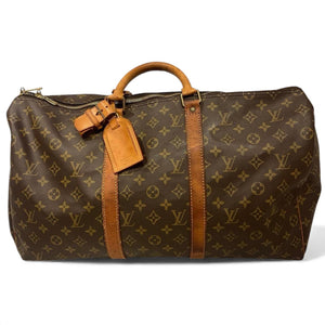 This Louis Vuitton travel bag features the iconic monogram canvas with natural leather trims and sturdy handles. It offers ample space for your travel essentials, combining style and practicality in a timeless design.