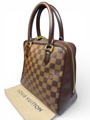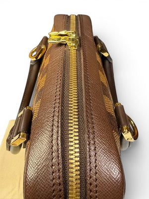 This Louis Vuitton handbag in the iconic Damier Ebene canvas features a classic checkerboard pattern with dark brown leather trim and gold-tone hardware. It has a structured shape with two sturdy top handles and a zip closure for secure storage. The bag is spacious enough for daily essentials while maintaining an elegant silhouette.