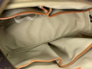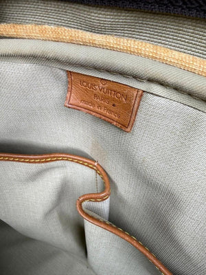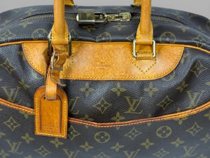 This Louis Vuitton handbag features the iconic monogram canvas with natural cowhide leather trim. It has a spacious interior with a zip closure and dual top handles for comfortable carrying. The bag is perfect for everyday use or travel, combining luxury with practicality.