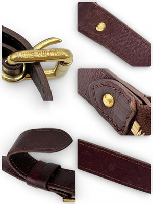This Louis Vuitton shoulder bag features the iconic monogram canvas with brown leather trim and gold-tone hardware. It offers a spacious interior with a zip closure, perfect for everyday use. The adjustable shoulder strap ensures comfortable wear.