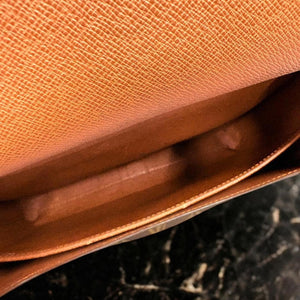 This Louis Vuitton shoulder bag features the classic monogram canvas with natural leather trim and an adjustable shoulder strap. It offers a timeless design suitable for everyday use or special occasions.