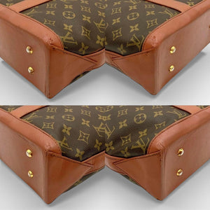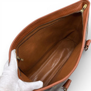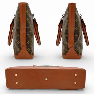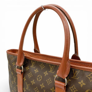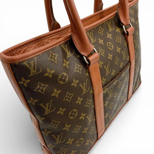 This Louis Vuitton tote bag features the iconic monogram canvas with natural cowhide leather trim. It offers a spacious interior ideal for everyday use or travel, complemented by sturdy double handles for comfortable carrying.