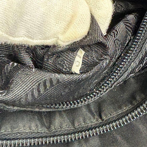 This Prada handbag features a sleek black nylon exterior with the iconic Prada logo plaque on the front. It offers a spacious interior perfect for everyday use, combining practicality with luxury.