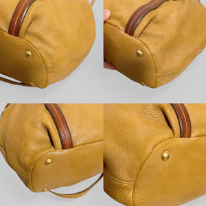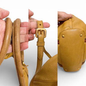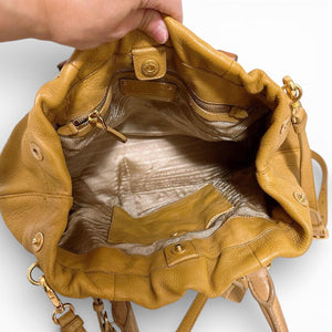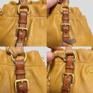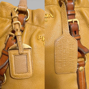 This Prada handbag features a soft yellow leather body with contrasting brown leather straps and gold-tone hardware. It has a spacious interior with a drawstring closure and snap buttons for added security. The bag includes a detachable shoulder strap for versatile carrying options.
