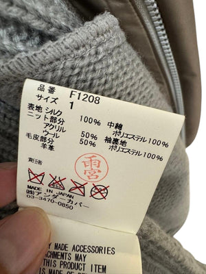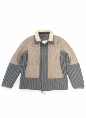 This Undercover men's jacket features a unique combination of knitted fabric and padded leather sections, offering both warmth and style. It has a full zip closure with additional snap buttons and a soft shearling collar for added comfort. The grey knitted sleeves and body contrast with the beige padded leather panels on the front and upper sleeves, creating a distinctive look.