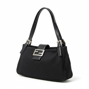 This elegant Fendi shoulder bag features a sleek black fabric body complemented by leather straps and silver buckle accents. It offers a sophisticated yet practical design, perfect for daily use or special occasions.