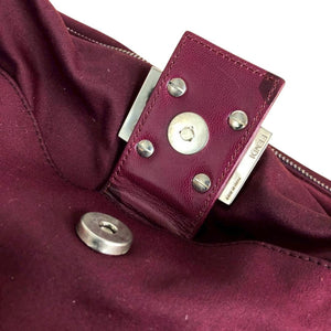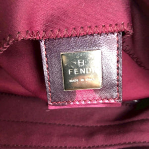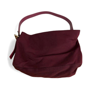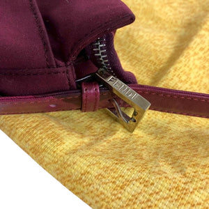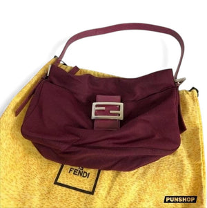 This Fendi baguette shoulder bag in a rich burgundy shade features a sleek design with a single strap and a signature silver-tone buckle on the front. The bag is crafted from a combination of fabric and leather, offering both style and durability. It is perfect for everyday use or special occasions, providing a compact yet practical accessory.