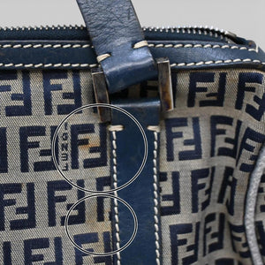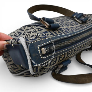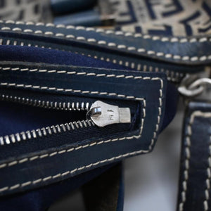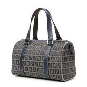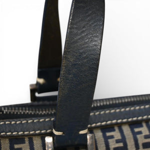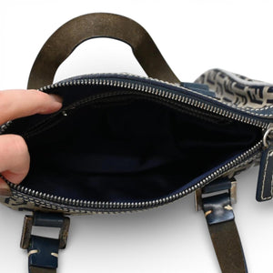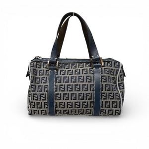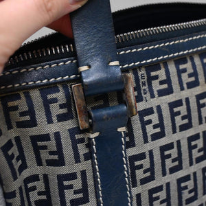 This Fendi handbag features the iconic Zucca monogram canvas with navy leather trim and handles. The bag has a structured barrel shape with a zip-top closure and an interior zip pocket for essentials.