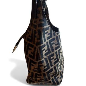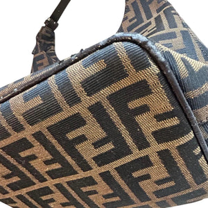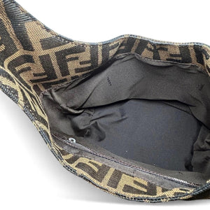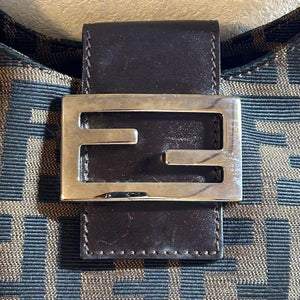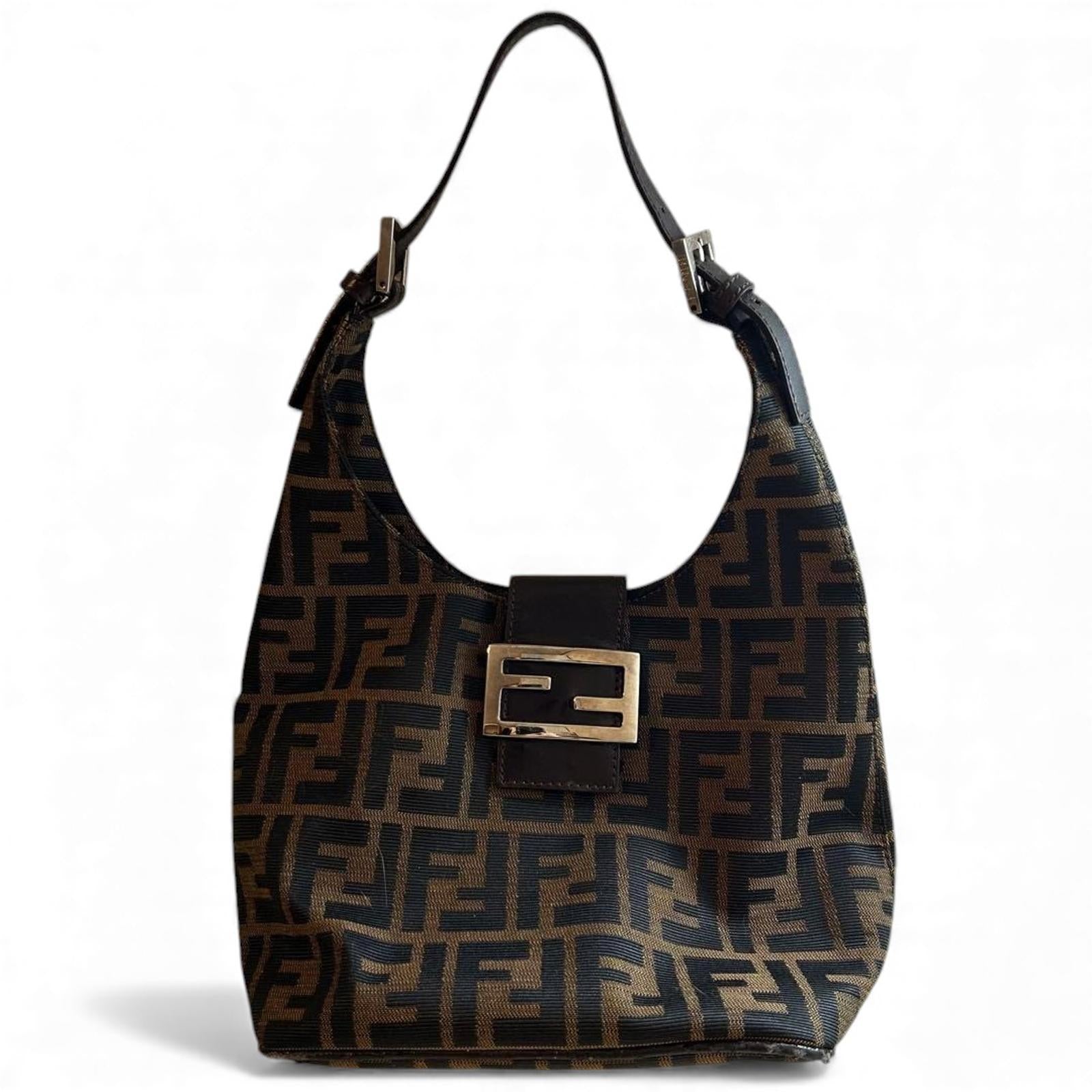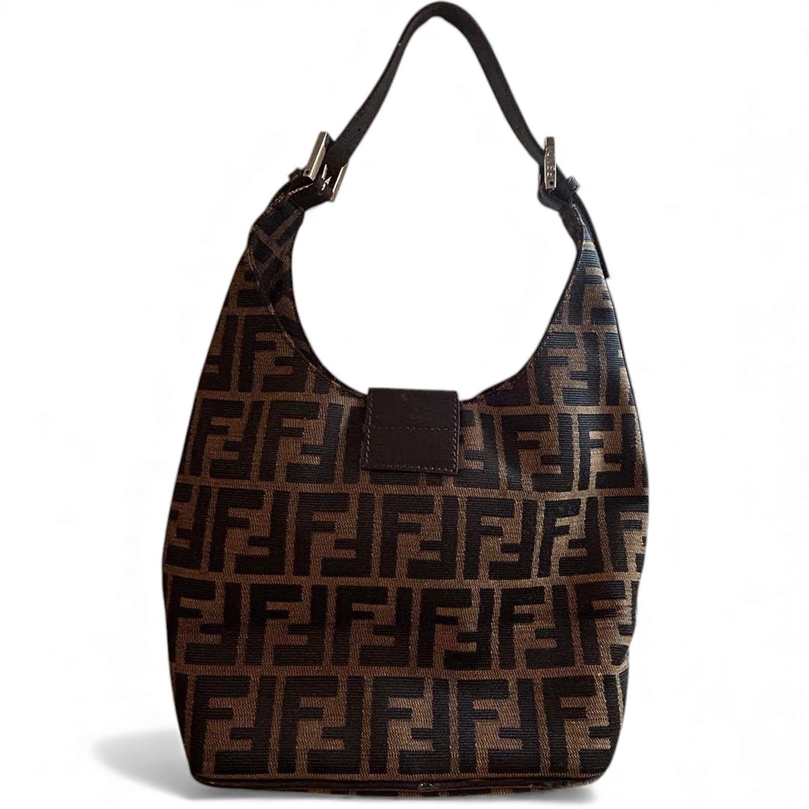 This vintage Fendi hobo bag features the iconic FF monogram canvas with leather trim and a silver-tone buckle closure. Its compact yet spacious design makes it a versatile accessory for everyday use or special occasions.