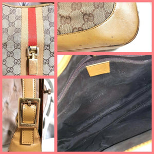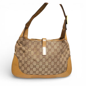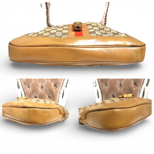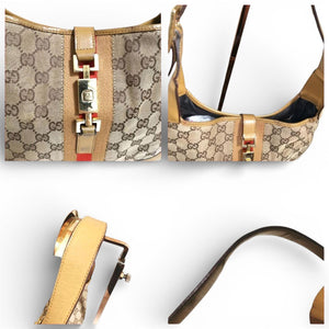 This Gucci women's shoulder bag features the iconic GG canvas in beige with tan leather trim and a signature red stripe detail. It has a secure top closure with a gold-tone clasp and an adjustable leather shoulder strap for comfortable wear. The interior is spacious enough for everyday essentials.